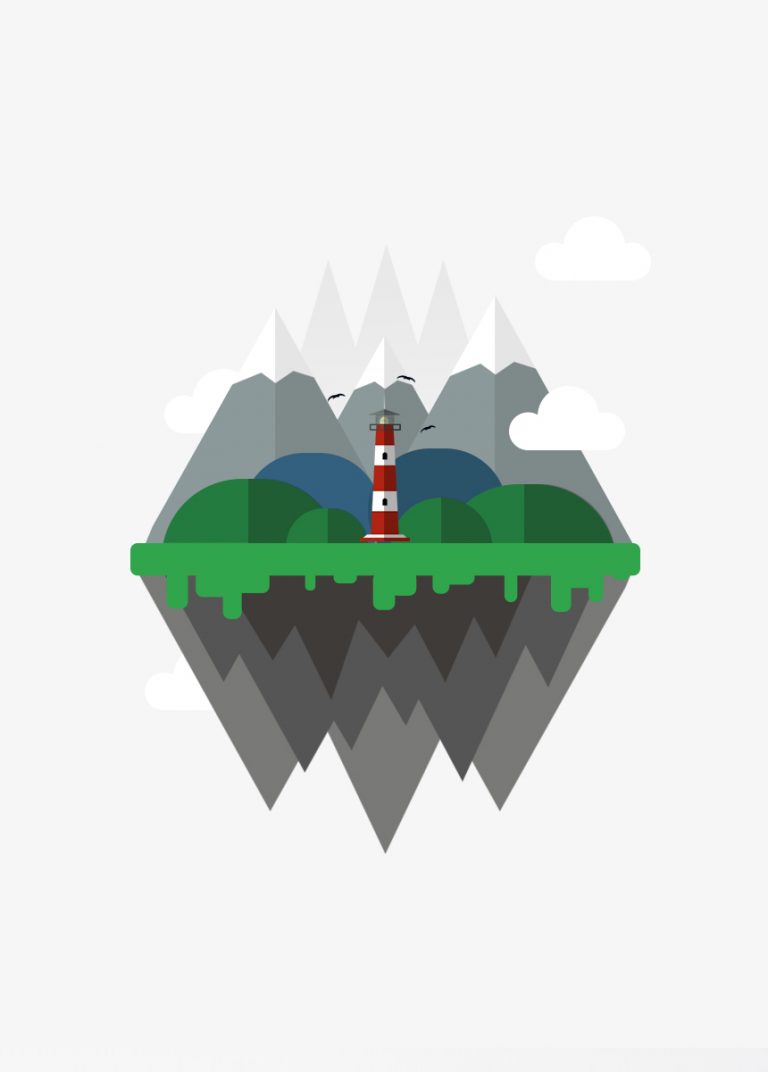 I recreated this landscape island in Photoshop and brought it into After Effects. With a few tricks, some camera angle changes and lighting effects, I had a full animation.